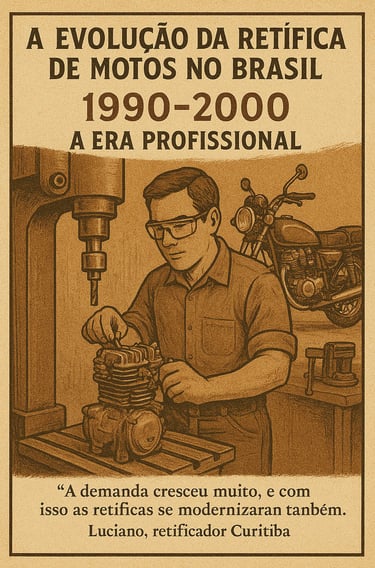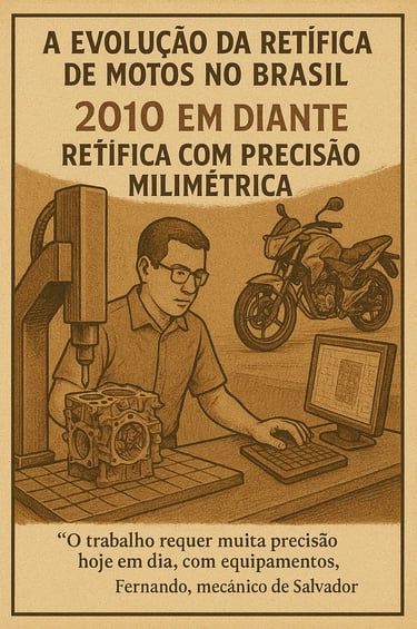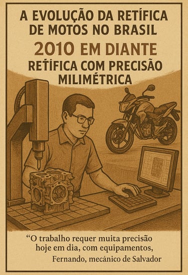 3.Técnificação e e especialização- décadas de 1990 e 2000:consolidação da injeção eletrônica nas motos ,exigindo novas ferramentas e conhecimentos. Retíficas passaram a utilizar instrumentos de medição mais precisos(como súbitos digitais e relógios comparadores).Aumento da oferta de peças retificadas, crescimento do mercado paralelo e recondicionamento de peças como comando de válvula ,bielas e vira brequins.