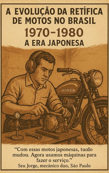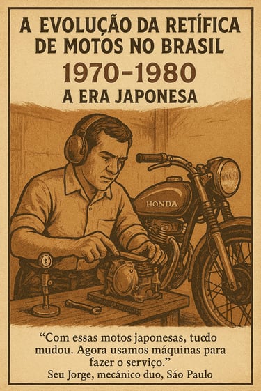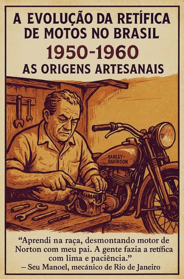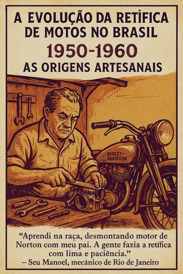 1.Início - décadas de 1950 e 1960: com a popularização das primeiras motocicletas importadas(como Harley-Davison e Norton)começaram a surgir oficinas mecânicas informais, muitas vezes improvisadas em quintais ou em garagens .A retífica ainda era bastante rudimentar feita com ferramentas manuais e com pouca precisão.